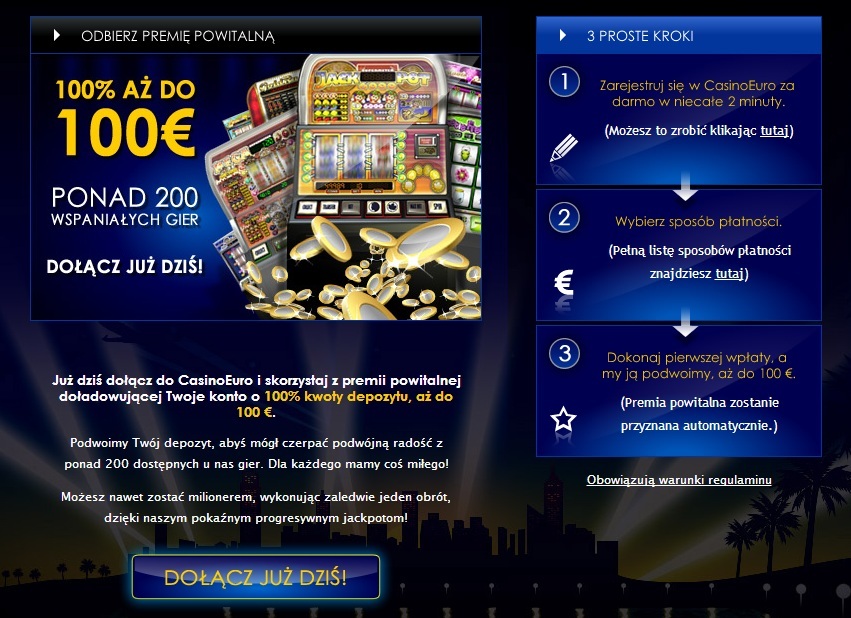 Bonus powitalny: 200EUR na start! Jeden z najlepszych bonusów kasynowych w jednym z najlepszych kasyn online... Czego chcieć więcej? Wysoka kwota bonusu, sprawiedliwe warunki obrotowe. Jednym słowem: Polecamy! Zarejestruj się w Casino Euro |